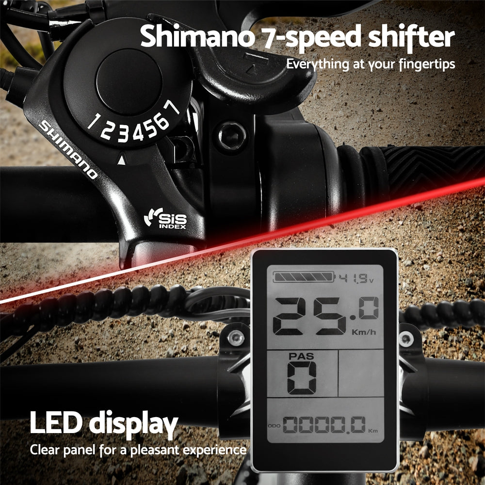 frame bike is easy to assemble, water-resistant, and perfect for mountain biking or exploring urban roads. The powerful 250W motor is paired with SHIMANO 7-speed gears and derailleur, making any terrain easy to tackle. With a 36V 10.4Ah removable rechargeable Li-ion battery, enjoy speeds up to 25km/h and a range of up to 60km on a single charge. Stay informed with the smart LED display panel and travel comfortably with the suspension front fork, height-adjustable saddle, and front and rear disc brakes. Our electric bike even comes with a built-in headlight and reflector for safe riding, while the durable wheels and tyres provide a smooth ride on a wide range of terrains. Suitable for riders with heights between 160-190cm and a weight capacity of 120kg. Charge time is between 6-8 hours. Get your electric mountain bike today for an unforgettable ride.
